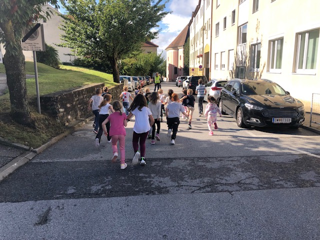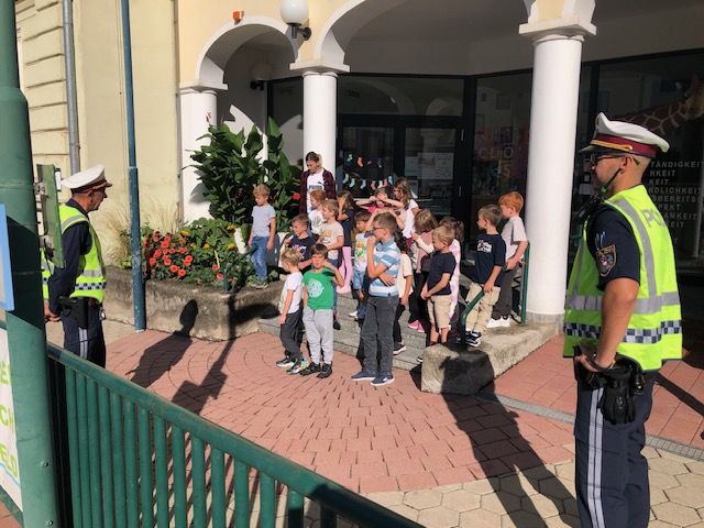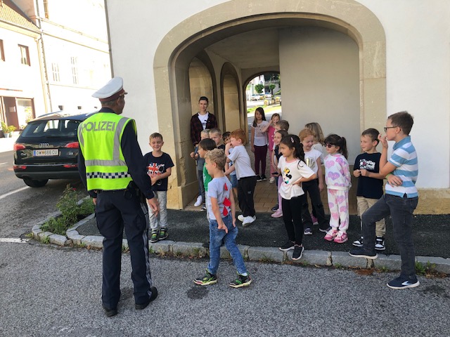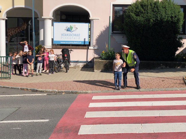 Gemeinsam mit den Polizisten lernten wir, sicher über die Straße zu gehen. Wir durften sogar einmal die Straße ohne Schutzweg überqueren.